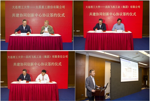 会上,副校长贾振元代表中心分别与太原重工总工程师陈清阳、沈飞集团副总经理兼总工程师李克明、昌飞集团副总经理林东签署了校企共建辽宁重大装备制造协同创新中心协议。至此,中心协同企业增加至7家。